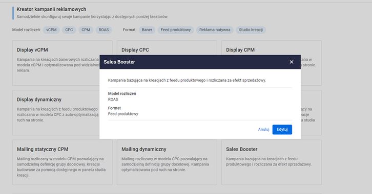 SalesBooster to nasze autorskie rozwiązanie dedykowane branży ecommerce. Narzędzie wykorzystuje machine learning, jest w pełni automatyczne, a, co najważniejsze, rozliczane tylko i wyłącznie za transakcje wygenerowane dzięki kampanii. Zatem sama kampania, poza transakcjami, dostarcza kaloryczny ruch oraz generuje spore zasięgi, co można wykorzystać w budowaniu bazy przyszłych Klientów sklepu.