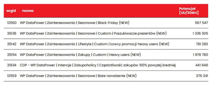 Z myślą o Black Friday i nadchodzących Świętach wyodrębniliśmy nowe, dedykowane segmenty, dzięki którym możesz precyzyjnie targetować reklamy do osób najbardziej zainteresowane promocjami i ofertami sezonowymi. To nie tylko zwiększy efektywność Twoich kampanii, ale również pozwoli Ci skoncentrować budżet reklamowy na odbiorcach, którzy są najbardziej skłonni do konwersji.